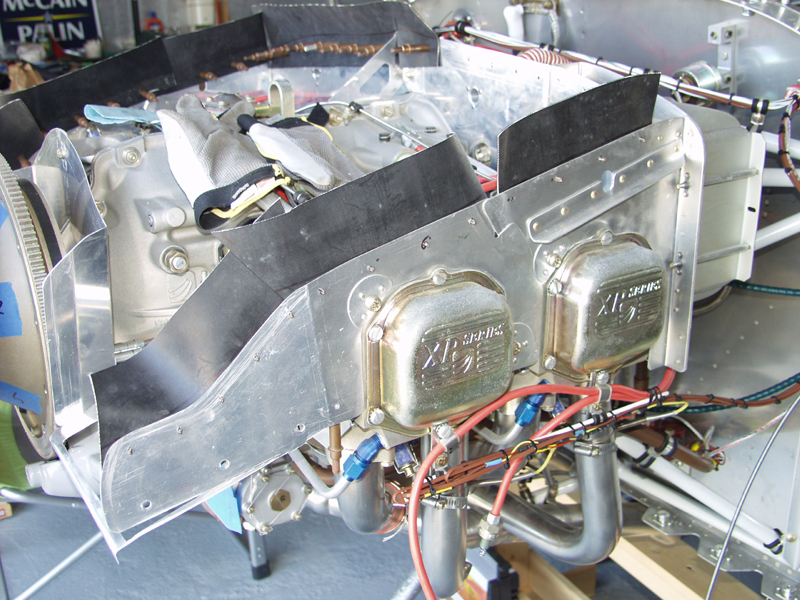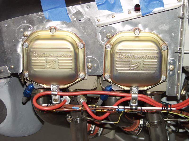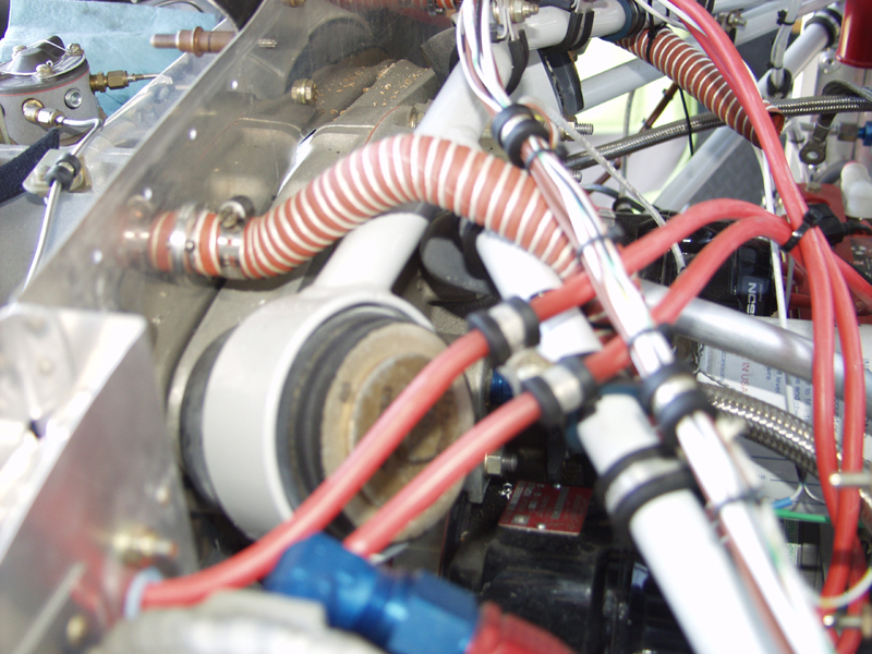 I started by drilling 2 holes in the back panel to run blast tubes to the magnetos. This constisted of mounting 2 of the 3/4 inch scat tube connectors I picked up. These get riveted over the hole facing aft and this gives you something to slide the scat tube over and clamp it in place.