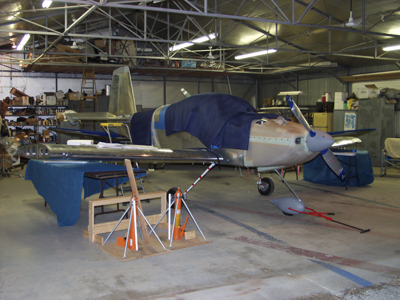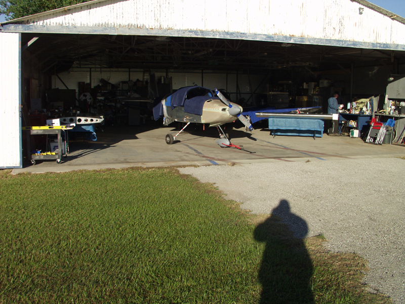 Well its finally time for the wings. Got to the airport at 7am and started getting things ready to take the fuse over to Kerby's hangar. Kerby has a hangar just down the taxiway from me and offered to let me use it for the weekend to do the install. Last night Kerby pushed his Swift back in the corner to give me room up front and Harley Dave helped me transport the wings to Kerbys. We left the wings laying on 2 tables on the appropriate sides.