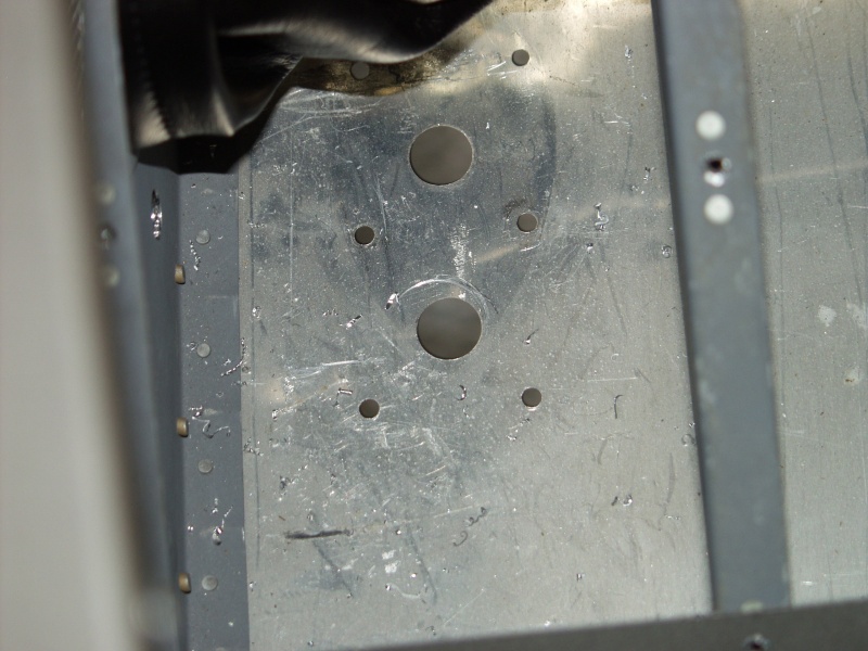 I removed the seats and floor pans yesterday so I was able to get right after it today. First I removed the 4 screws holding the antenna and the coax connection. I pulled the slack out of the cable to make sure I had enough to reach back a few more inches. Instead of drilling 4 new screw holes my plan was to use the rear 2 holes for the new front 2 holes. I used the backing plate as a template to drill the rear holes and the center holes starting with a small bit and then enlarging to final side.