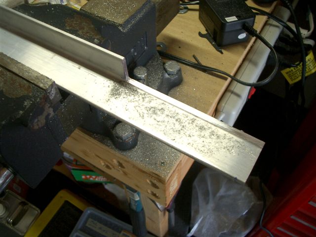Next I cut the bottom 717 longerons from the 1 x 1.25 stock per the plan length. You have to cut a area from the longeron to give clearance for the landing gear weldment. I drilled a #10 hole to give a nice radious in the corner of the cuts and filed it smooth. Clamped everything in place tight to prepare for drilling thru the steel firewall brace. There are 4 bolt holes that need to be drill here. This is a good stopping point.