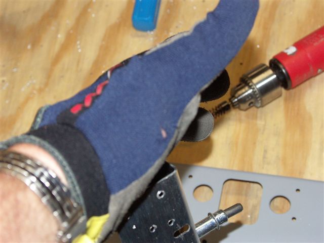 I match drilled all the holes on the top channel piece using the seat back pieces. Deburred and primed so I can be ready for riveting tomorrow. I almost had a Rick Petco accident "American Chopper" with the pneumatic drill. Good thing I had my gloves on or it could of been really bad. The picture shows the hole but as the glove twisted up on the bit I thought it was worse. Anyway it got my attention and reminded me how quickly you can really screw up and get hurt if your not careful.
