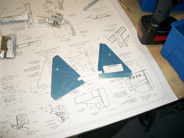 More fabricating. Marked up the F-684 gussets for trimming. I used the #40 drills to get the radius for the cuts of the funny little cutout area and then bandsawed it. Is that a technical term?