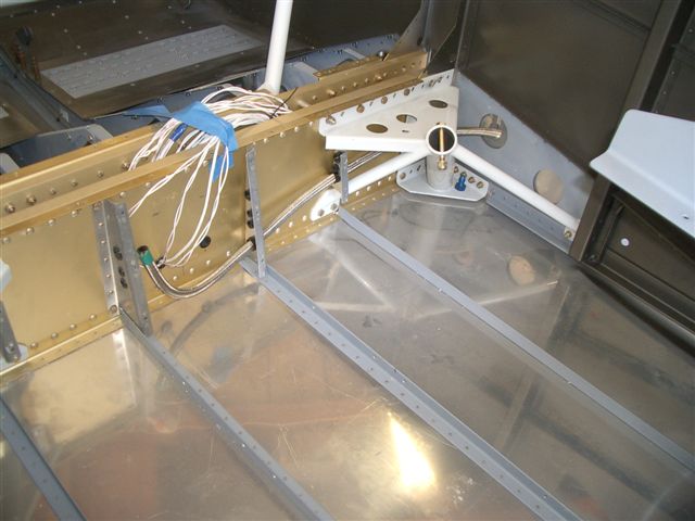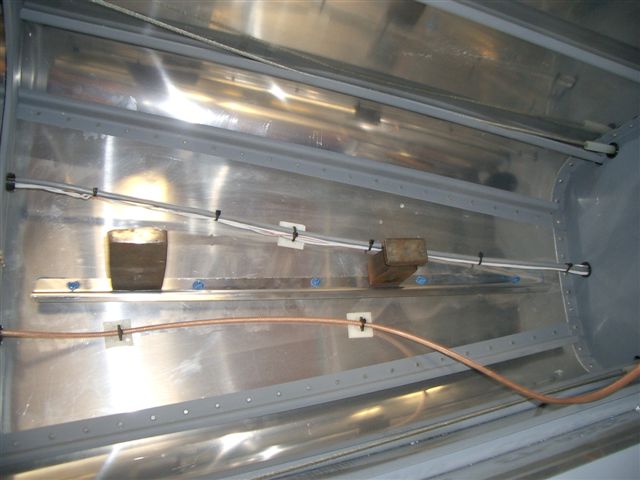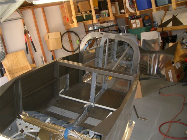Finished the interior paint. Primed and painted the inside rear cabin skin so when riveted in place it will be completed. Might still have to touch up the shop heads. Also primed and painted the baggage area stiffeners. While I was waiting for the paint to dry to remove the masking and paper I was checking out the aft section while it was still open. I decided to add a Dan Checkway mod to prevent oil canning on the bottom skins. I cut 3 sections of left over Jchannel and drilled some holes in them to allow RTV to seep up thru to hold the channels in place. Also installed the rear push tube for the elevator.
