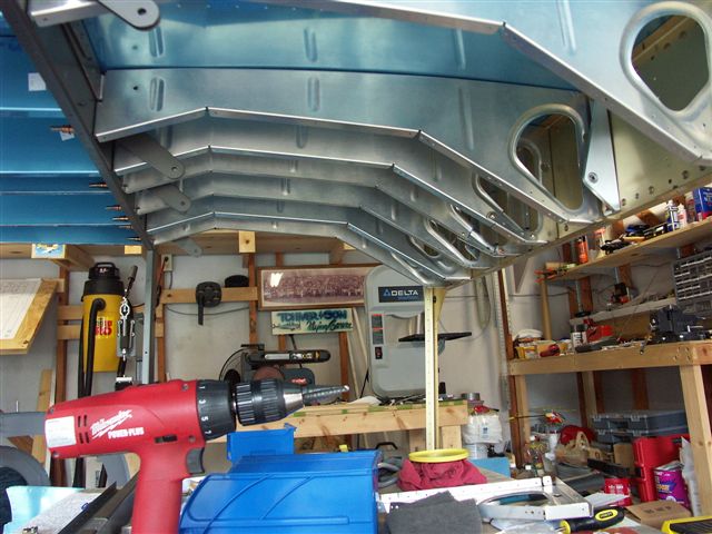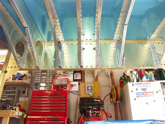 Next I put the bottom center section skin in position and started to cleco to the ribs and bulkheads. This all lined up pretty well.