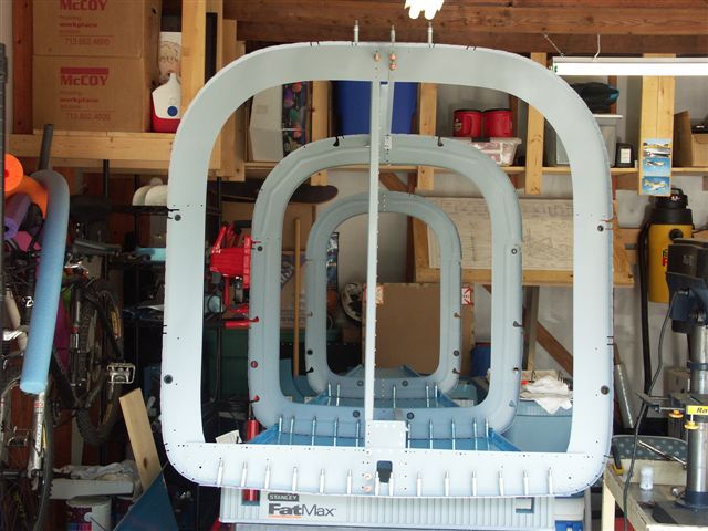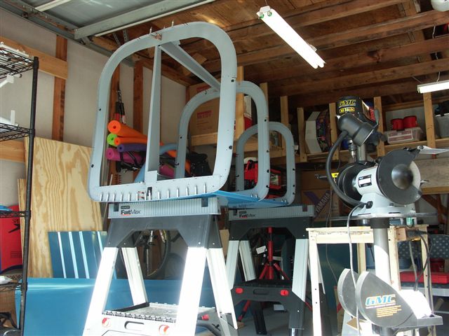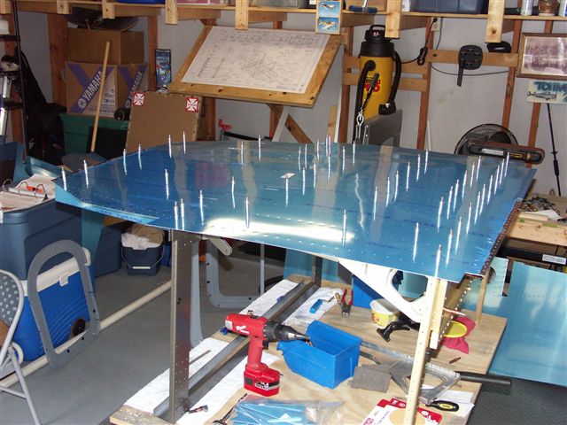 Stopped at Lowes today and picked up some Stanley FatMax saw horses. These are really cool because the legs raise up independently to a height of 39 inches. Better for older builders...... Time to start putting something together that looks like an airplane. I layed out the aft bottom skin on top of the sawhorses and clecoed the 708, 707, and 706 bulkheads. Finally something that looks COOL!