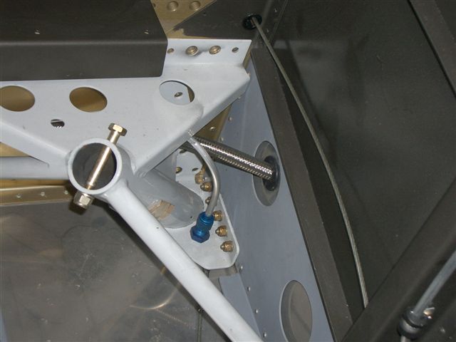 Now it was time to quit putting off these last 2 brakelines. I started with the left side. I straighted out a piece of the 1/4 inch tubing coil and pushed it in from the open side towards the floor fitting. As it moved into the area of the gear weldment I bent it up slightly to go threw the hole over the one the flex fuel like went thru. This allowed a larger upper bend radius which I thought would allow a better chance of not getting kink in it. This worked well. It was tight getting the flare tool in there but I was able to do it.