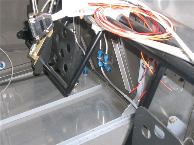 Last I bent the tube into the center area allowing it to flow under the fuel lines and valves and worked it towards the firewall and over to the firewall fitting. Installed the last flare and installed a piece of plastic tubing to prevent chafing where it passes over alum angle. It's DONE! Getting late so I will get the right side next time.