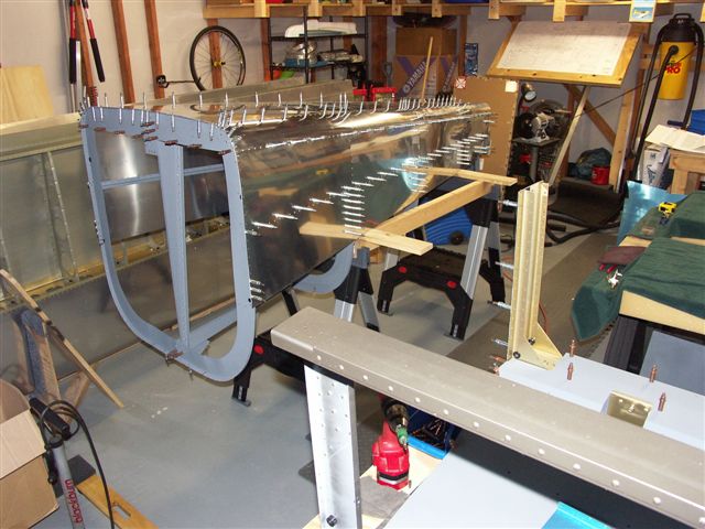 Well its time to flip this thing and get ready to complete these rivets in the aft fuse. So I had to change the position of the saw horses and add some framework to hold the aft section upside down so as to get the right angles for riveting.