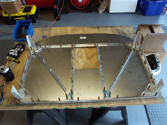 Moved on to firewall. It's made of Stainless steel. Clecoed stiffeners, gussets, and engine mounts to firewall. Ready to start the drilling. The instructions say to use lots of Biolube to keep from dulling the drill bits. Luckily most of the holes are predrilled and you only have to final the size.