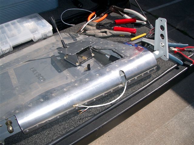Next I installed the servo pushing the connector thru the grommet. Mounted the elevator with the temporary pins and could not figure out a way to fish the wire thru to the elevator. Then I noticed a bigger problem. The hole was for the screw in the servo. The one for the wires was further to the right. Grabbed another grommet and the drill and went to town. Reinstalled and added some more wire to make the fishing easier. This time it worked.