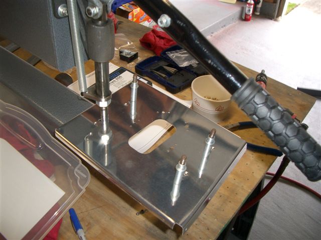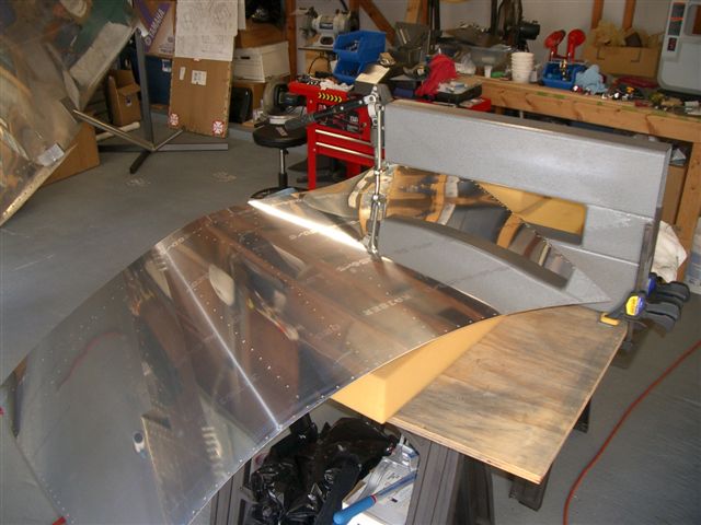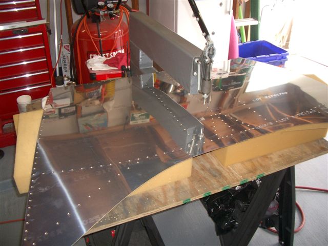 So since I cleaned up the shop yesterday after flying with Jon I was able to hit the ground running. First thing was to remove all of those clecos and get the skins off to debur. I still had the plastic on the outside so I took them in the house and warmed them a bit over the stove to make removing the plastic easier. That sure wooks good. Next I deburred and then setup the DTRT-2 for one of my last dimple sessions. Last I dimpled both skins and the J-stringers. Then used the hand dimpler to knock out the top of the bulkheads.