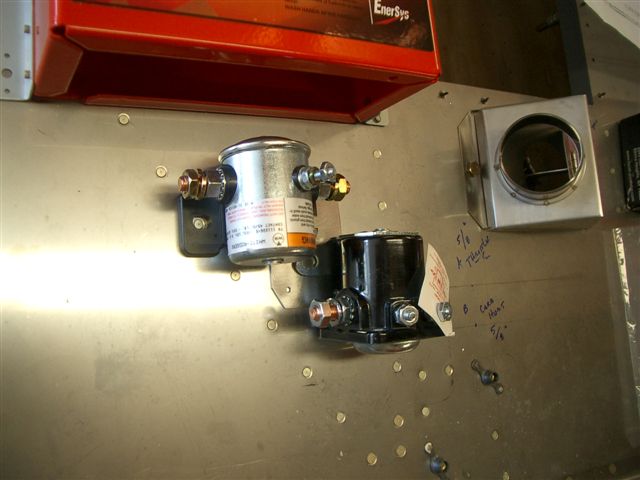 Now it is time to mount the master solenoid and starter solenoid. The bulkhead plate did not match up to the bolt pattern on the 2 solenoids. I will remake it and rivet it in place and then drill thru the firewall and bulkhead after marking the proper bolt pattern.
