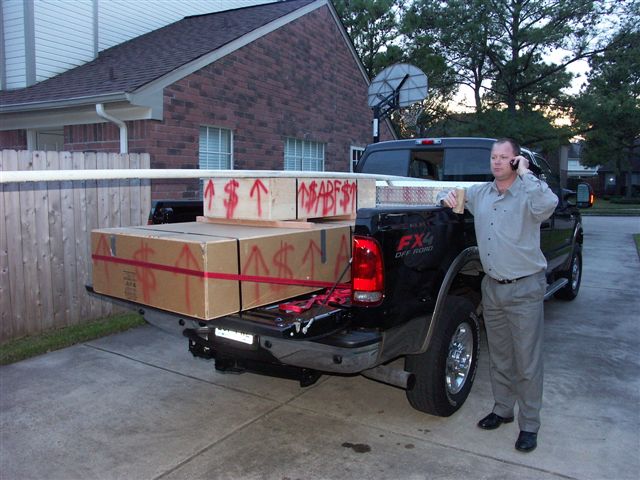 Turned out that my buddy John had to work in the afternoon and I had a meeting in the morning so we had to scrap him helping me. So I called Big Fred. He is the guy on the cell phone in the first picture. He just bought a new F350 so I figured it could handle the job!