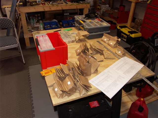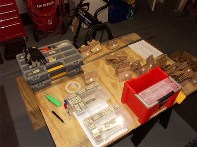 I picked up some cheap parts trays to keep everything organized. This really helps with all the little bagged items. Kim is writing the bag number and part number on masking tape for the appropriate slot.