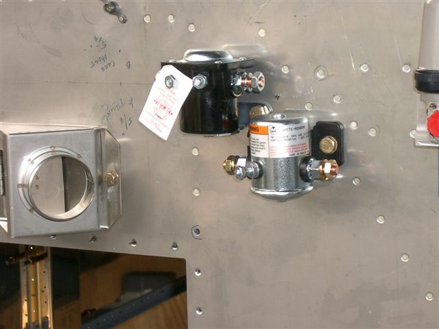 Next I used the bucking block and rivet gun with the dimple dies to make the dimples in the firewall. Once the doubler was riveted in place I used bolts to hold the nut plate in place while drilling the holes for the rivets. Then I backriveted the nutplates. Last I bolted the contactors in place.