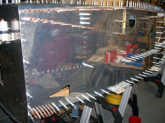 Next we moved along the aux longeron and the 902 bulkhead. Between the heat and mosquitos we had to stop. It came out pretty good. I am looking forward to backriveting as much of these skins as possible as they come out more consistant.