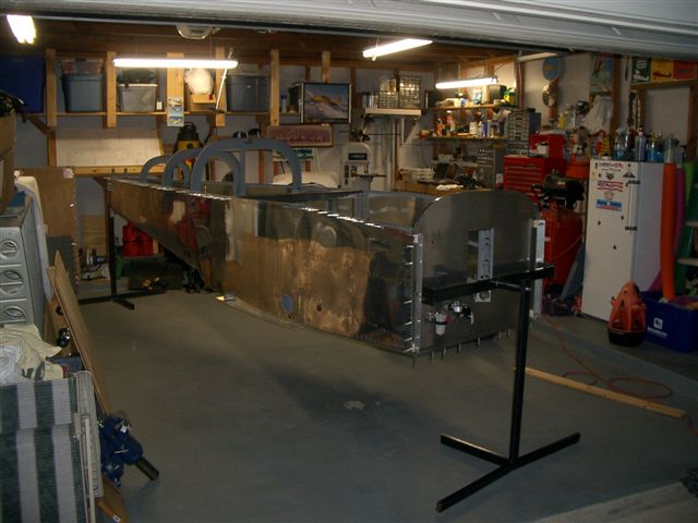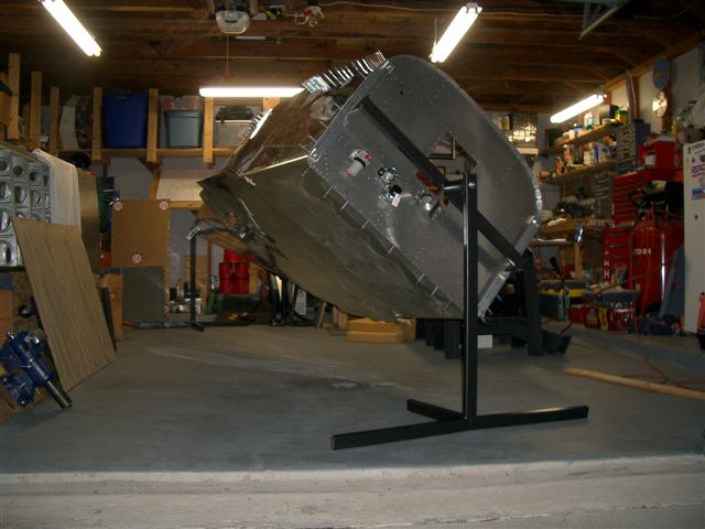 When Fred arrived we moved the fuse out to the driveway and sit it down on foam pads. I cleared out the saw horses and made room for the stand. We moved the fuse back in position and Fred lifted the front while I held the back. My sister Judy held the front from moving while we clamped the tail piece to the back stand and checked it for level.