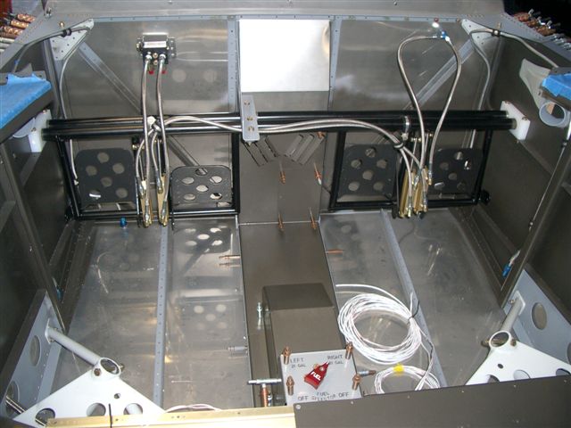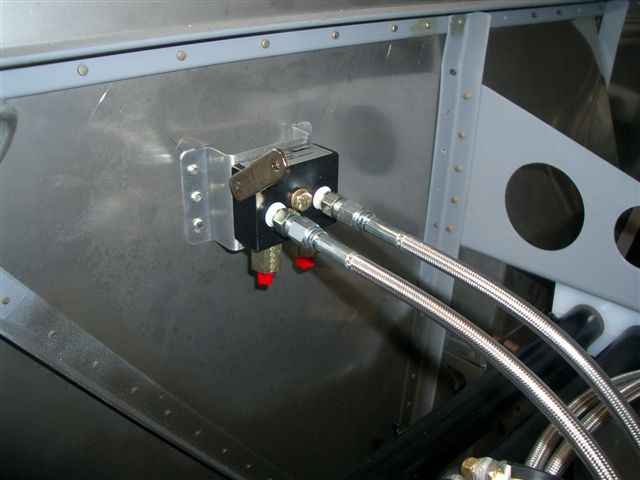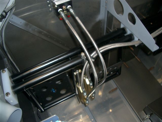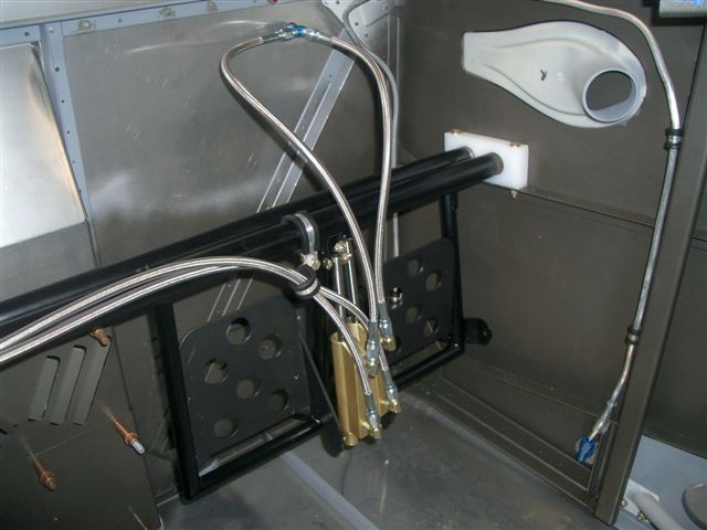 Ok started out with the parking brake. I used Dave Abrahams idea on the position of the parking brake. Basically centered it over the fittings below on the firewall. This puts it straight into the lower fittings on the pilot side and straight down to the lower fittings. From there they go over to the center section and back to the 704 bulkhead and down to the gear fittings.