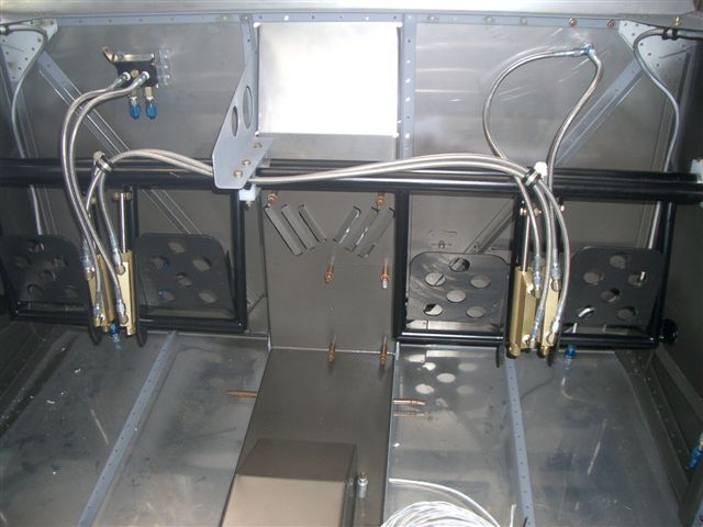 Also need to make the lines that pass from there back to the exit fittings at the gear legs. Once I get it up on the gear so I can put the seats in I will drill the bottom of the rudder pedals for the master cylinders.