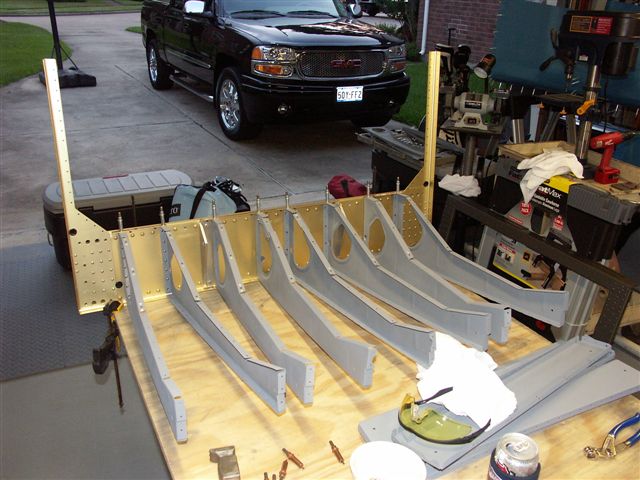 Completed installing the nutplates to the seat ribs. Drilled bolt holes for the bulkhead. Started riveting the seat ribs to the 704 bulkhead.