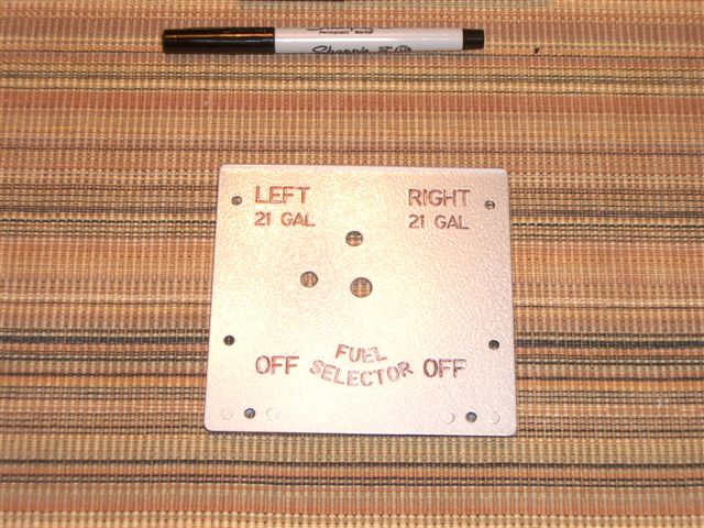 Next I saw a few weeks ago in the RV Builders Hotline a tip on using fine point Sharpies to blackout the letters on your fuel valve plate if you get it engraved by Bill Ester. SO I primed and painted the plate and gave that a shot. I think it will work I just need a few more coats of Sharpie in the letters and it will be good to go.