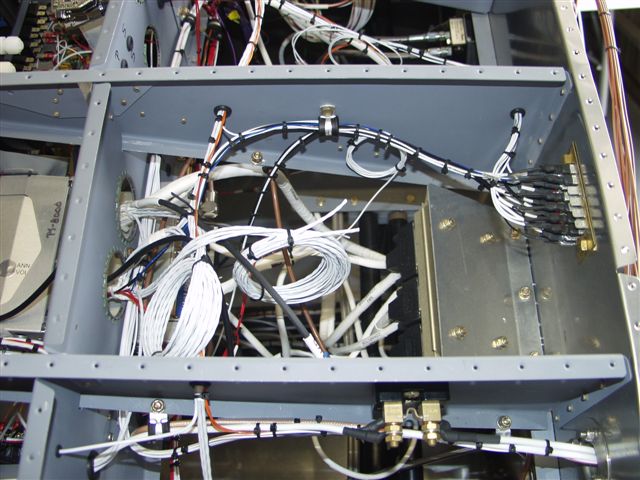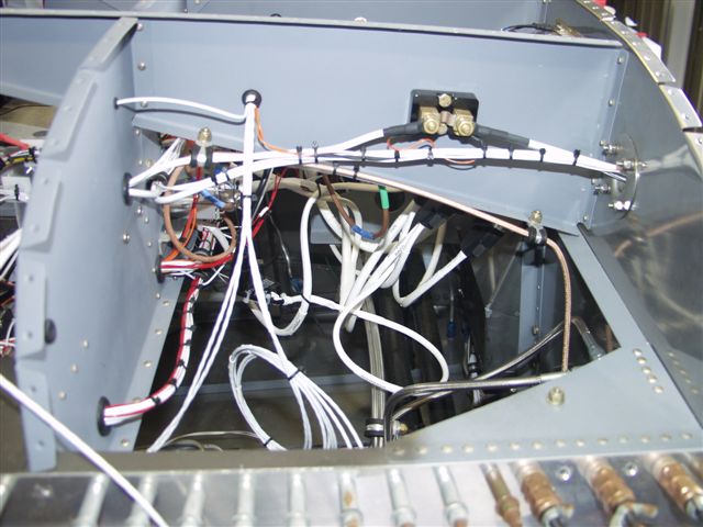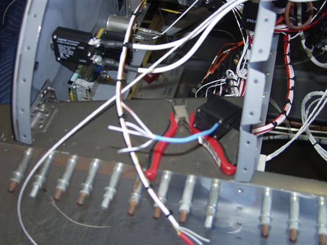 Wiring is now complete except to finalize the PTT switch in the stick grips. The wires are run throught the wing spar but still need to be run up the sticks.