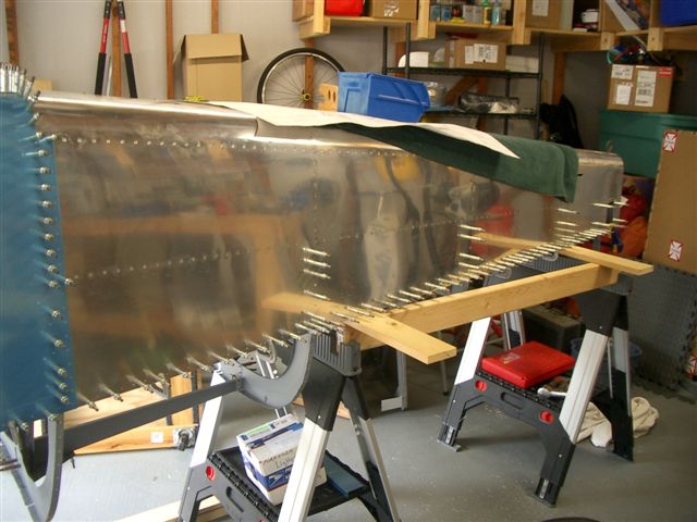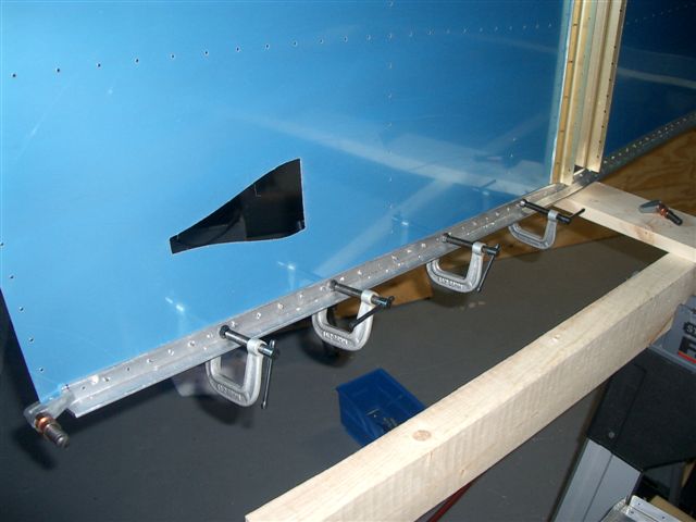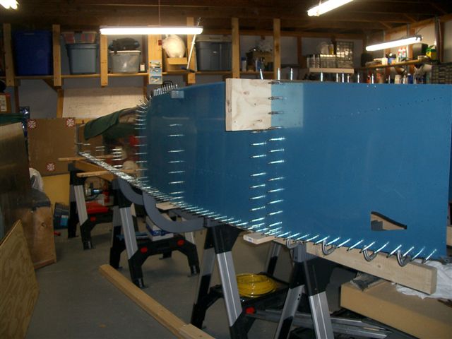 Next I clamped the skins to the longerons for match drilling. Starting at the rear I worked towards thr front clecoing every other hole. This is fairly time consuming due to the thickness of the longerons. Then repeated on the other side.
