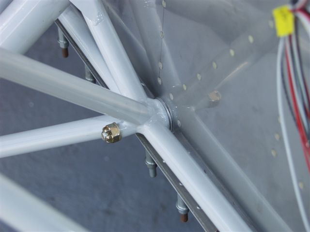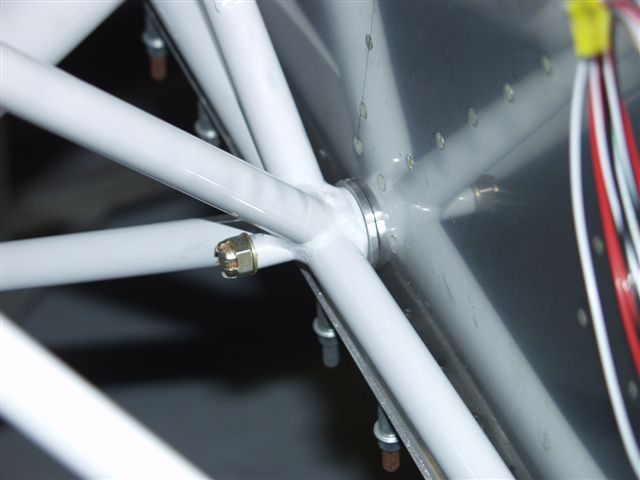 Next I had discussed with Jon how Jeff B had made his engine mount spacers out of .063 instead of the 1/8 inch spacers and he agreed they were very snug. So I fabbed up some washers out of the .063 and replaced them. The goal here is to fill in part of the gap and still be able to use the existing bolts and not put too much pull on the mount or the firewall. Harley Dave stopped by and held them in place while I slid the bolts thru from the back side. Works out nicely.