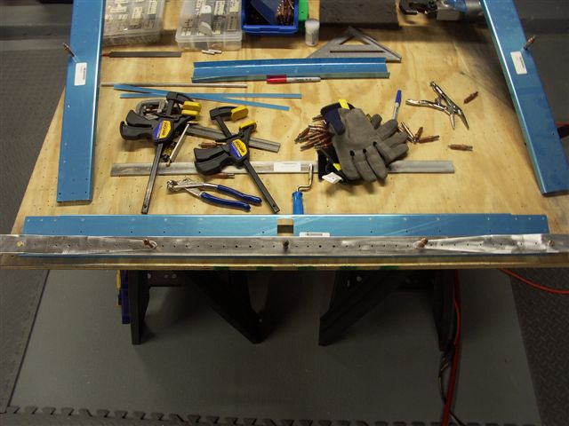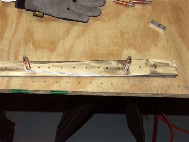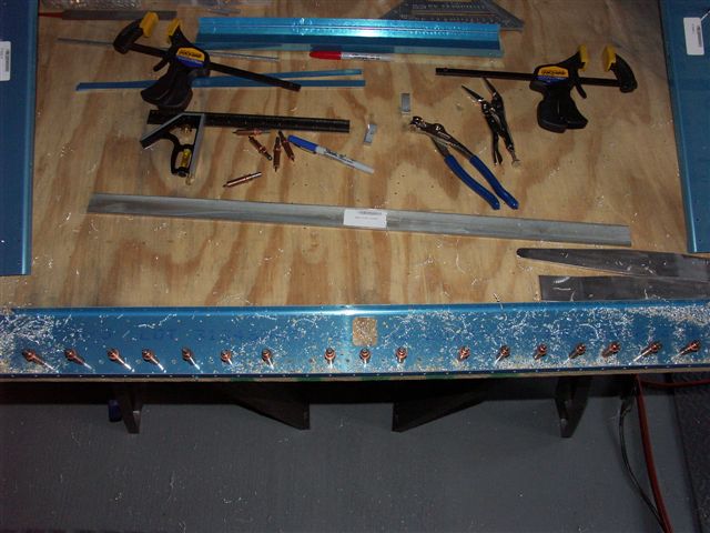 Next I cut the 2 shims that create the space between the long bar and tappered pieces. The bottom of the bulkhead is predrilled so I just clamped it down over the barstock and used it as the drilling template. #30 holes for the rivets and #12 for the seatbelt brackets. This worked well just clamping down the bulkhead over the bar and clecoing as I went.