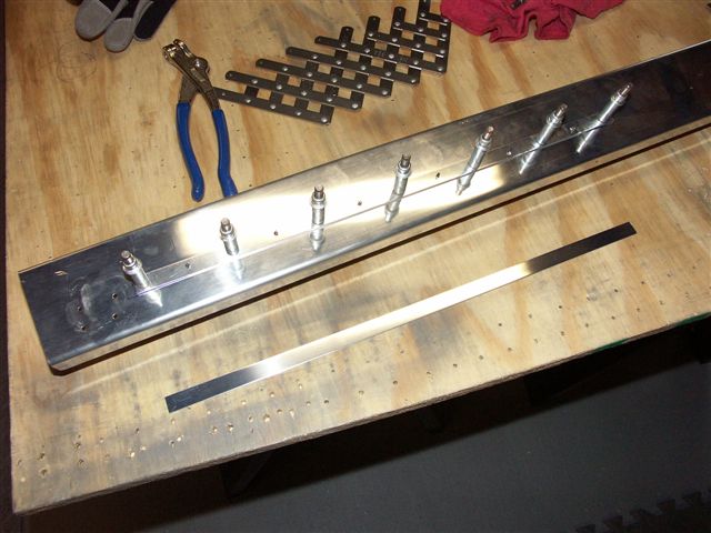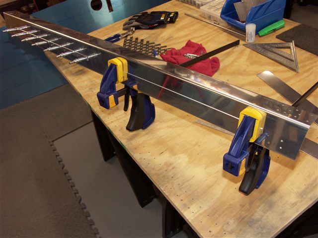 Finished up the last 2 seatbelt brackets. In order to clear the rivet hole next to the bend in the tappered bars you have to trim off about 3/16 inch of the bolt flange of one left and one right seatbelt bracket. Again just clamp it tight and drill.