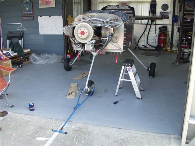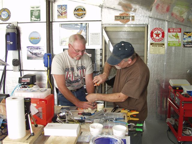 Engine team members Jon, Mike, Phil, Jim, Harley Dave and special guest all the way from Scotland, Ian Corse all did a fantastic job at making my life easier. I got to the hangar around 9:30 and Jon showed up first. We needed to get the front wheel bearings staked and installed on the front gear to allow the rotating stand to be removed from the tail to get things started. Shortly thereafter Mike showed up on his HOG!