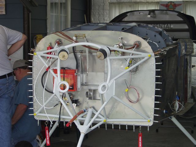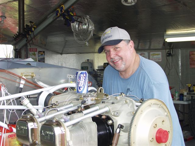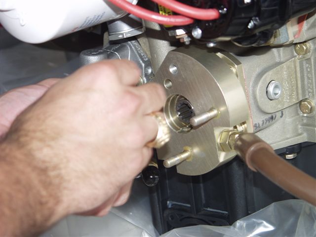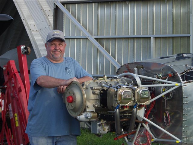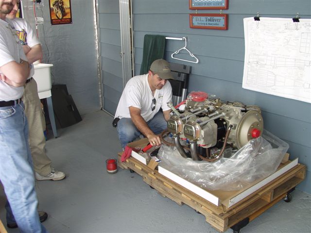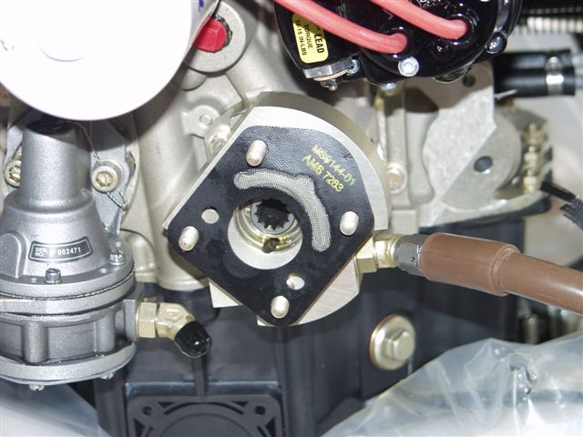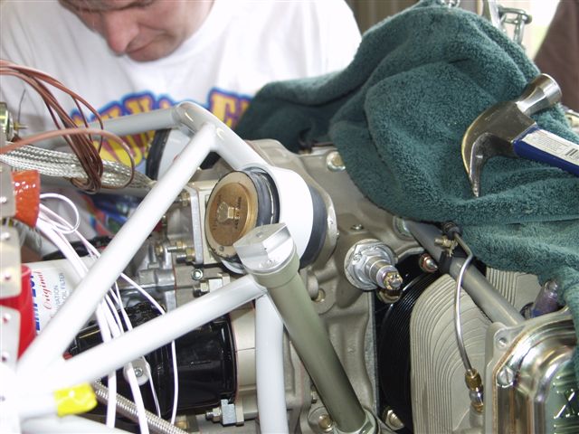 Next came preparing the engine for the big hang. This consisted of installing things that are either imposible or very near to do once the engine is on the plane. The first thing was the propellor govenor. In preparation I printed out a picture from the VAF website and then forgot I had it. Phil installed the studs and Jon started the process of clocking the control arm and installing the cable bracket. After much confusion on what the proper position to install it I produced the picture which proved we were doing it correctly. Glad the team didn't shoot me.