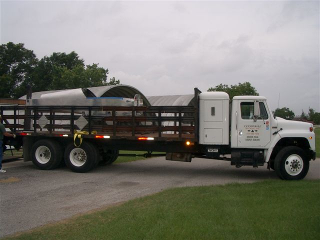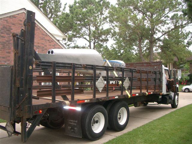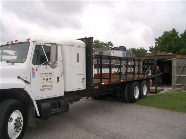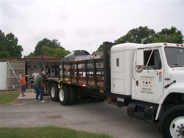 Thanks to Rick and Cannonball Trucking the bird is in the nest. Rick and Kim picked up the truck at Cannonball this morning and Jon Baker and my dad helped me get things ready to move. I couldn't do much since I hurt my back yesterday. About all I could do is push the buttons on the lift. This kind of truck would be a problem if the engine and gear were already on but we were able to get the front of the rotating stand on the lift. As I raised the lift up to the truck level Rick walked the front onto the truck and Kim, Jon and Dad walked the rear stand to the back of the lift. Once on the truck they used a ladder to climb onto the back of the lift and then walked it into the middle of the truck.