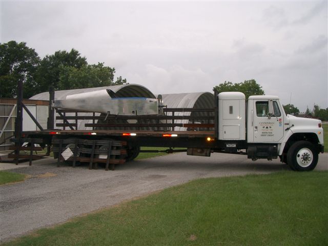Rick used wide straps to hole the stand in place. He put one more strap over the center cabin areal to steady the slight rotation. We put a bolt in the front of the stand to lock the rotation and taped it in place. Then it was ready for the short ride to the airport. Its all back roads out of the subdivision and a short ride down the frontage road along Hwy 290 to Weiser.