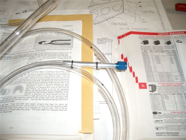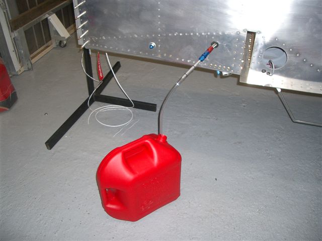 Well it was getting too late to start cutting metal so Jim K stopped by for a beverage and give me some ideas to move on with. When I get the power run I will want to test the fuel pump so I bought some unions and fabbed up some alum tube flared fittings to connect tubing to. Also picked up some gas cans which will be needed to caliberate the fuel sensors. When I test the fuel pump I will put a can on each side where the fuel tanks will connect at the fuselage. Also one can at the front will connect at the firewall where the fuel will go to the engine. With the pump on I can move the switch thru its left right positions and check for fuel flow to a can in the front and check for leaks at all of the fuel pump flares.