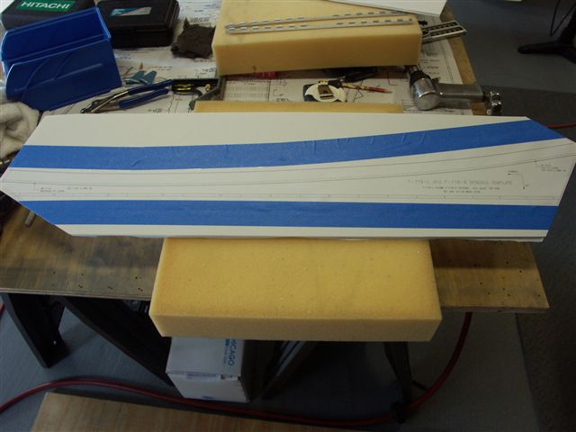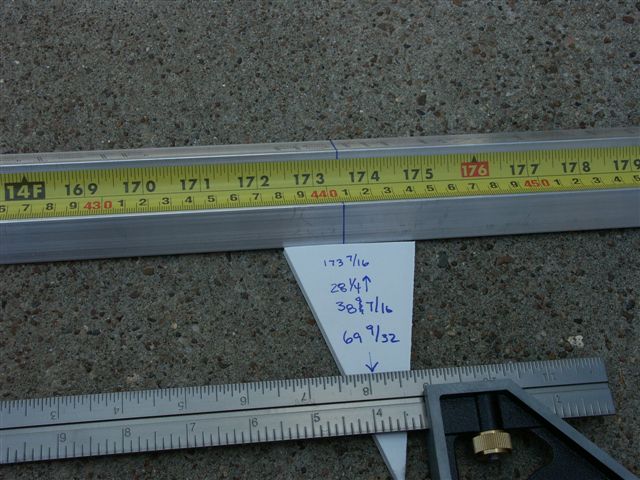 I cut the bending template away from the plansheet. Next I taped it to a piece of corigated board for stiffness. Measured the longerons to 173 and 7/16. Cut them to length with the cutoff saw. Then I Marked the bend start and stop points. This is kind of nerveracking because they are so long it makes you feel like you are going to screw them up. I just followed the plans and measured and marked and then did it again.