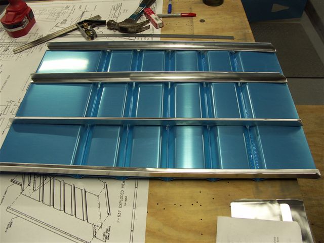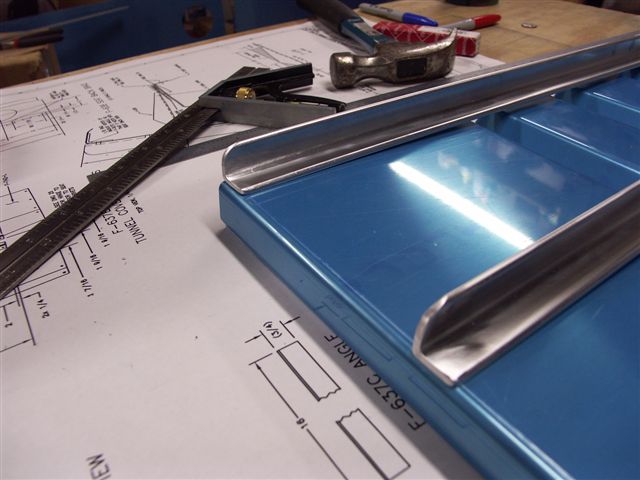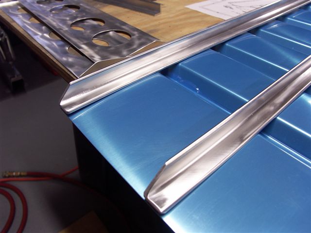 Next I used the chop saw to cut the 4 angle braces for the set backs. Cut the bottom 45 degree angles and rounded off the tops to a 3/8 radius using a dime as a template. I ground everything smooth with the scotchbrite wheel and polished up with the die grinder.