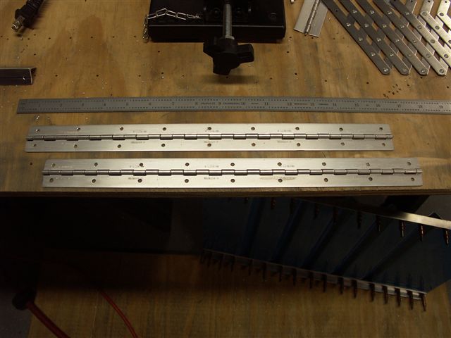 Next I used the cutoff saw on the hinges. Then I marked the rivet pattern and drilled on the press.