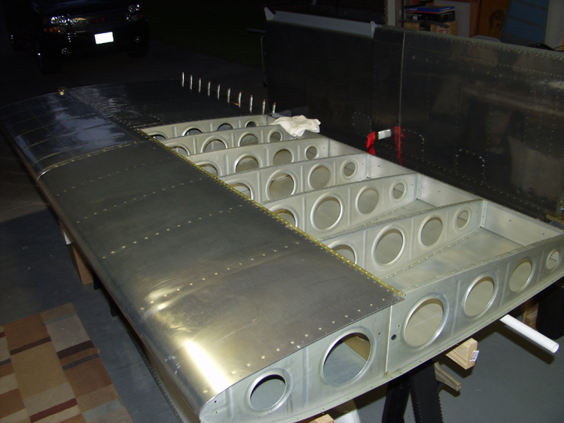 Got Derek to help me move the left wing back to the cradle and then putting the right wing on the work table. I really have a good jumpstart on this one since as I worked on the left I did the duplicate work for the right wing at the same time. I already have the aileron brackets with the bearings installed and riveted together and clecoed in place. Same with the aileron brace and flap bracek. Time to move it.