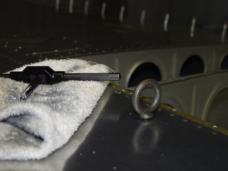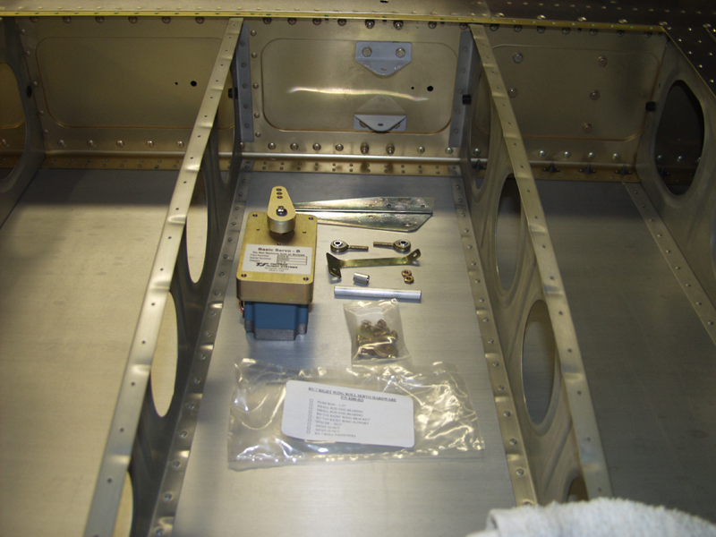 Once the hole was drilled I deburred and put the controls together. I safe tied the bolts holding the servo to the replacement bracket and then bolted it all in place. I started thinking about the wiring harness that is stuck up under the panel at the hangar. It would sure be easier to install it now in the wing. I am going to have to cut it anyway so I decided to take a wing measurement from the bellcrank area to the wing root and then run over to the hangar and number each wire and cut it. Then I can run it thru the snap bushings.