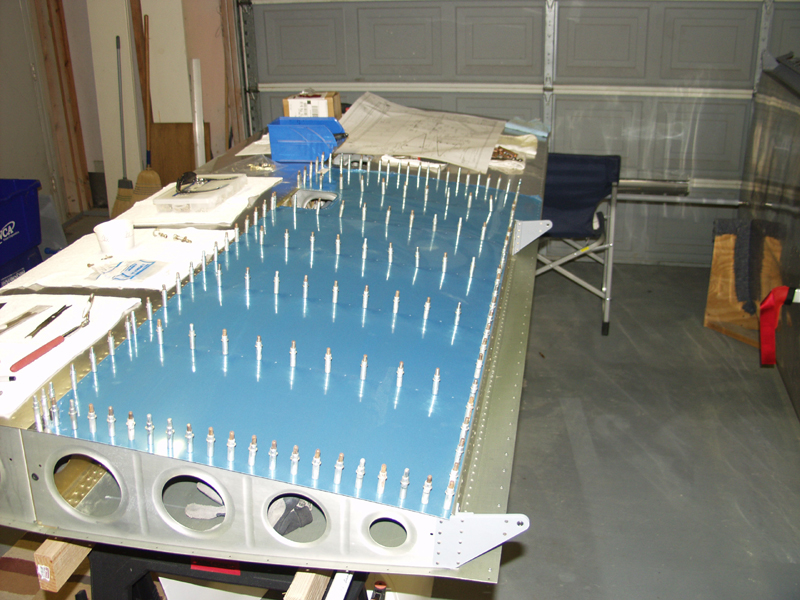 This pic was from after the skin was installed and I then made the first drill pass. Next I move the clecos and made the second pass and then removed the skin to debur and dimple. I know the other stuff was getting getting my fuel guardian ready to install when I do the SB for the fuel pickup on this wing.