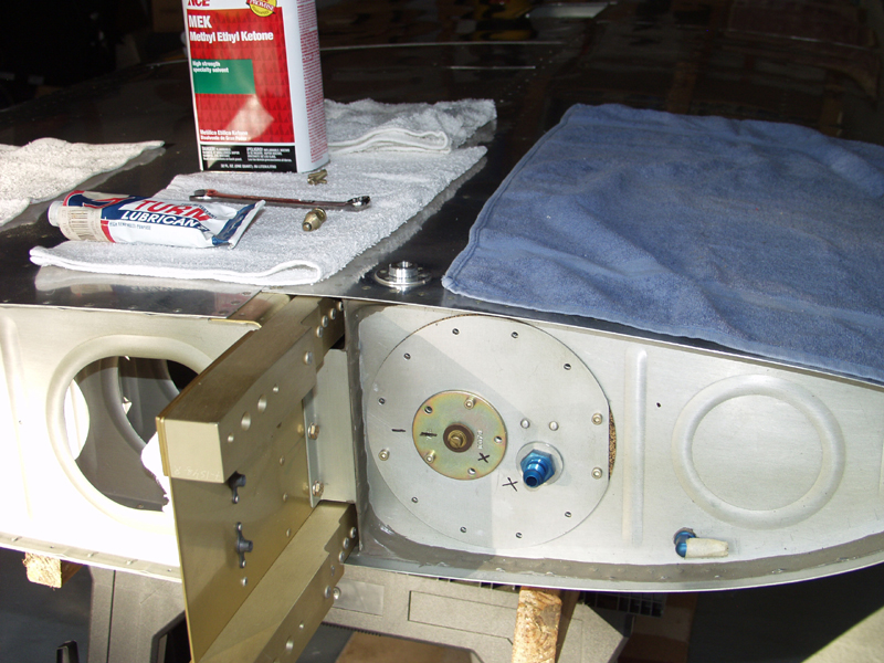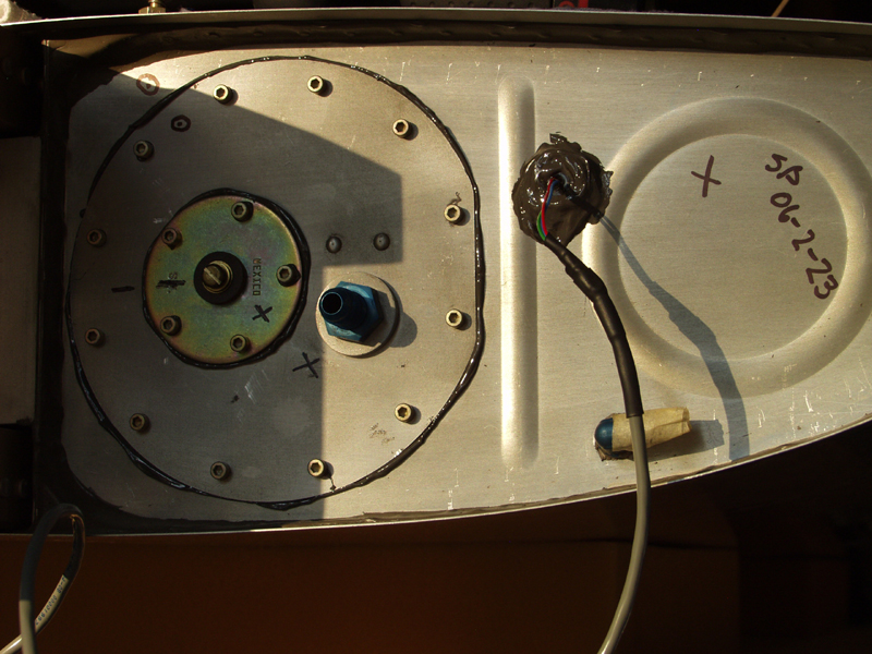 Same drill as yesterday. Remove the fuel sensor and main plate and cork seal. Drilled a hole for the Airplane Extras fuel sensor. Mixed up a batch of proseal and installed it. Resealed up the tank and moved on to the landing light.