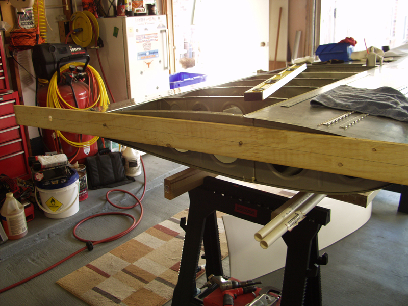 OK so after sleeping on it and looking over the plans I also came across a post on VAF with pictures of a guy that made the jig out of wood. I knew I kept those plywood slats for something useful some day. I drew a line in the cender and drilled a #12 for an AN3 bolt to pass thru. I flipped the board over and bolted it in place. I put another AN bolt thru the rear tooling hole in the wing next to the rear spar. I moved the board back and forth to make a mark across the center line. I removed the board and drilled another #12 for the rear bolt.