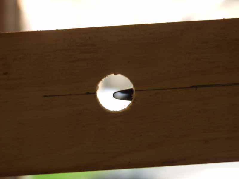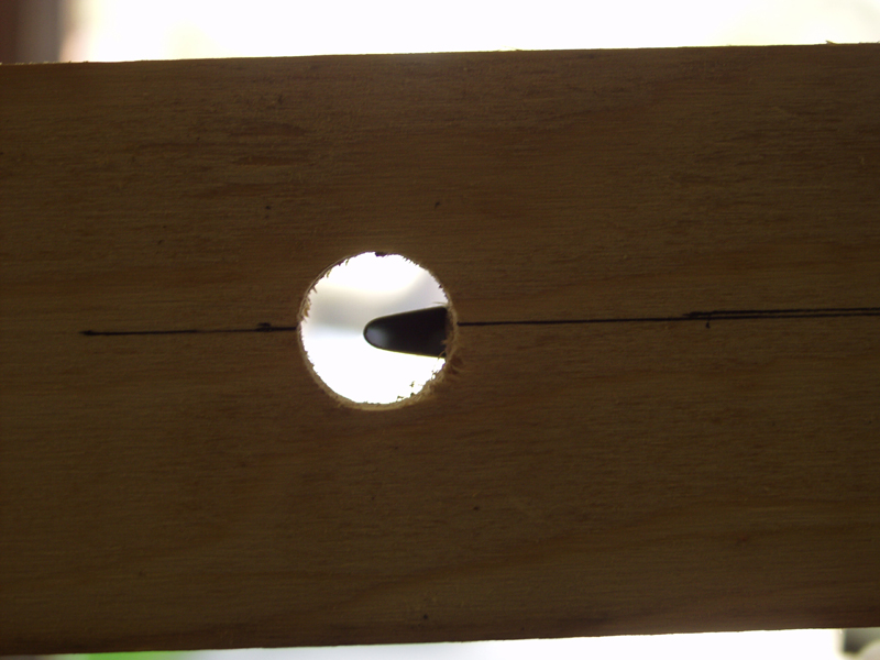 Next I measured where the very tip of the trailing edge of the aileron would be and drilled a 1 inch hole so I would be able to see the position of the aileron tip. This is all outlined on page DWG 12A of the plan sheets but the pics really help make it clear on VAF. As you can see on the first hole picture I was close with the eyeballing it the night before but it was still a tad low or actually high since the wing is upside down. I removed the bolt on the aileron to free up the rod and adjusted the rod ends one turn each and then still had to go one half each and now its dead on.