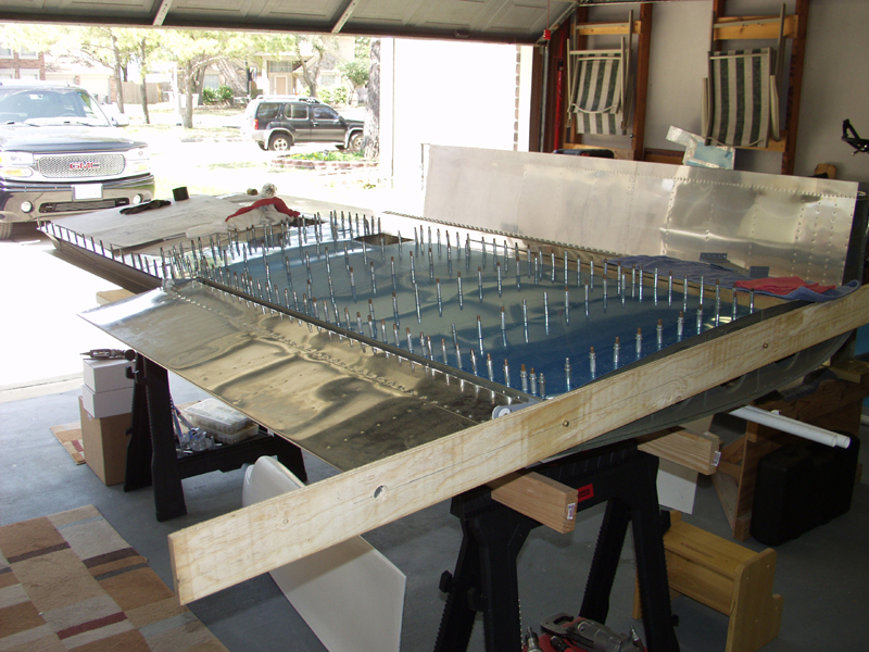 Next I installed the bottom skin to prepare for drilling. This pic is before the first pass. Then move all clecos 1 to the left and redrill those holes. I can sure tell that this is what caused me to get those shots in my arm from Dr. Nelms last year. I am sure glad these are QB wings. Only one more skin to go.